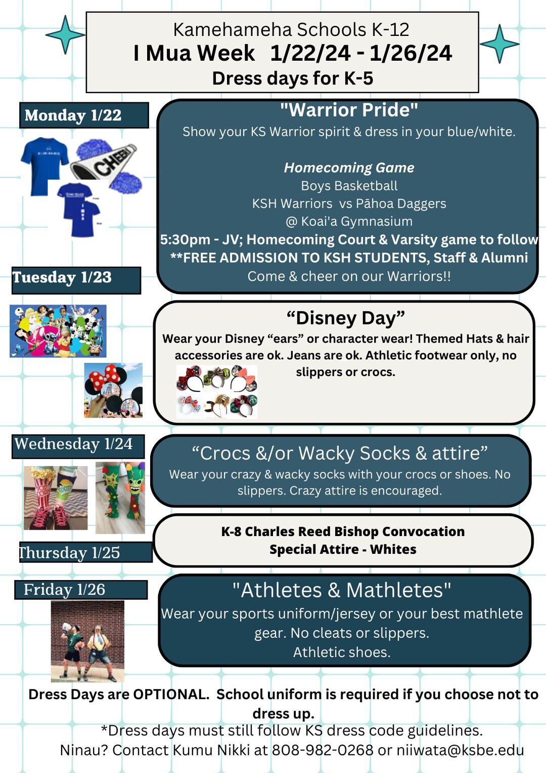 See the flyer above or the email from Kumu Nikki for more specifics on dress days. Every day except Thursday is optional for dress and uniform can be worn as a different option.