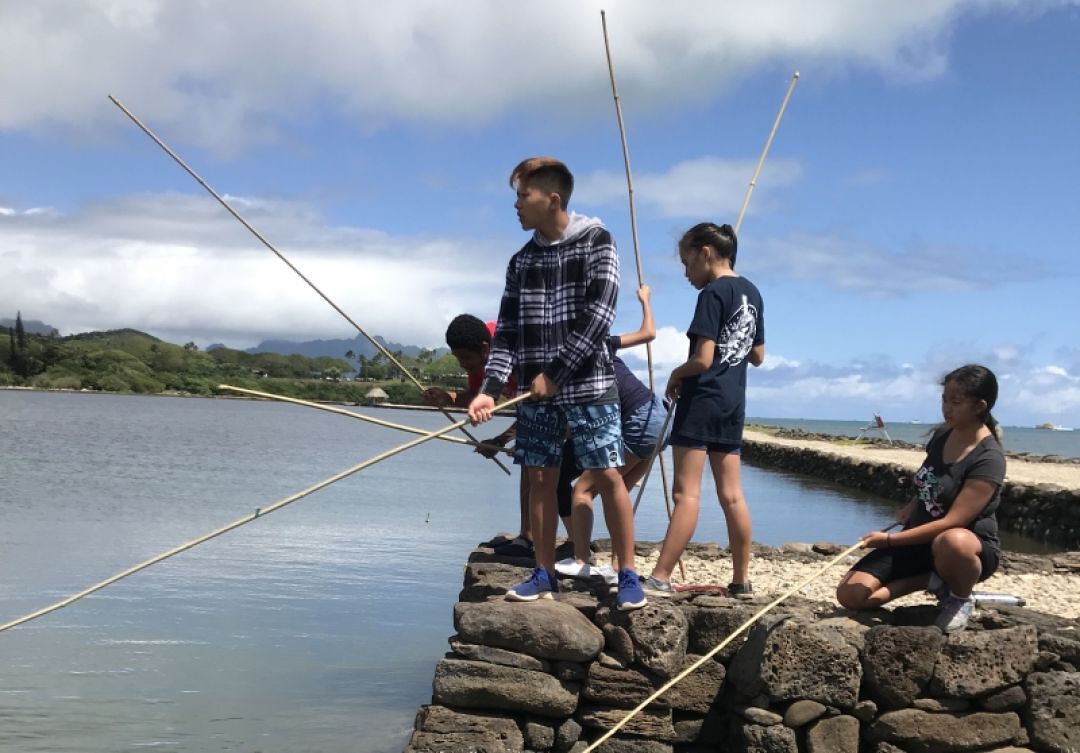 KS Kapālama Kula Kiʻekiʻe (high school) Kumu Tisha Louis’ Biology class collaborated with Senior Instructional Technology Specialist Tim Freitas on a makau (fish hook) project, and through a partnership with Paepae o Heʻeia, haumāna were able to test their fish hooks while simultaniously helping to eradicate invasive species at the fish pond.