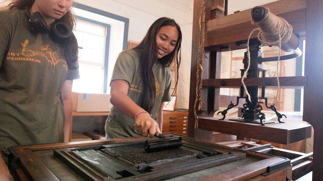 Haumāna from Kupu Nā Leo try their hand at traditional printing at Hale Paʻi, connecting to a legacy of Hawaiian literacy and resistance.