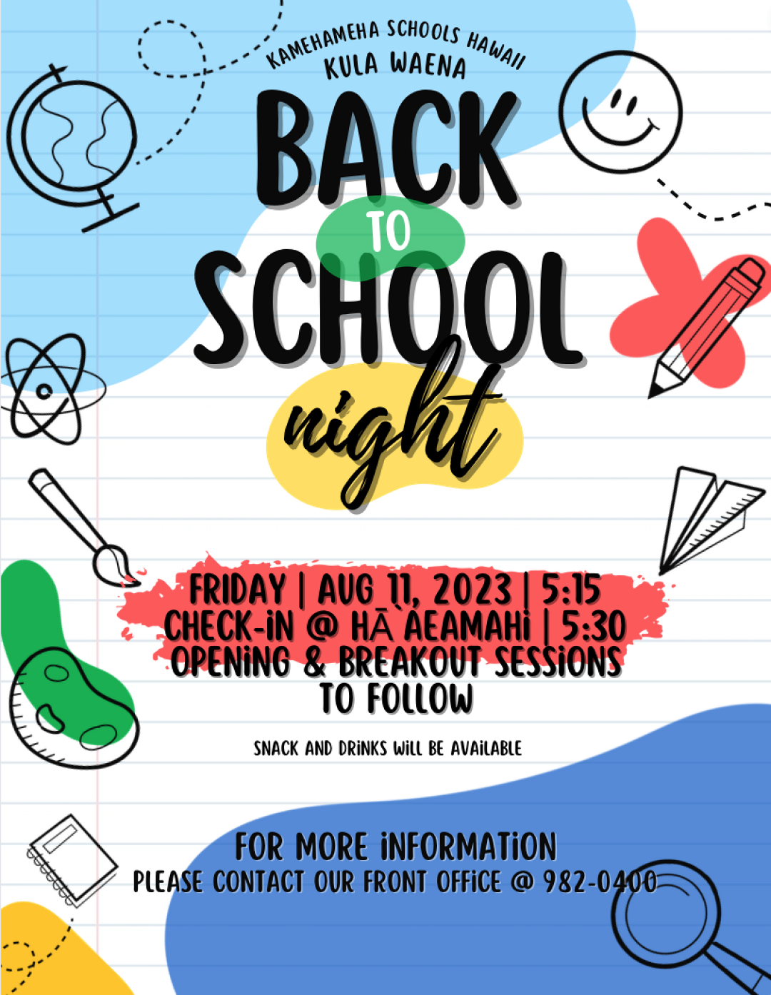 ʻOhana are invited to our Kula Waena Back to School Night this Friday, August 11, starting at 5:15 p.m. in Hāʻaeamahi Dining Hall.