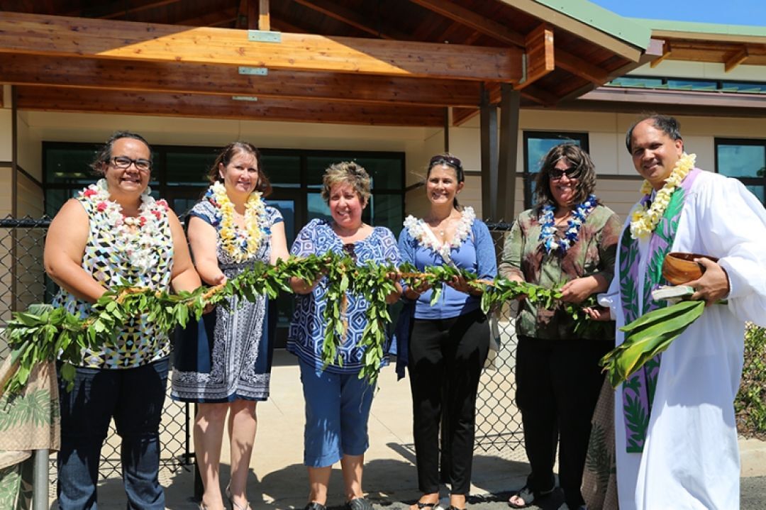 KS’ Kalei Ka‘ilihiwa, Nicole Souza and Paula-Ann Burgess, and Silvia Sharrar and Melodie Vega from PACT – Early Head Start help Kahu Kordell Kekoa untie the maile lei at the entrance to the Infant and Toddler Center.