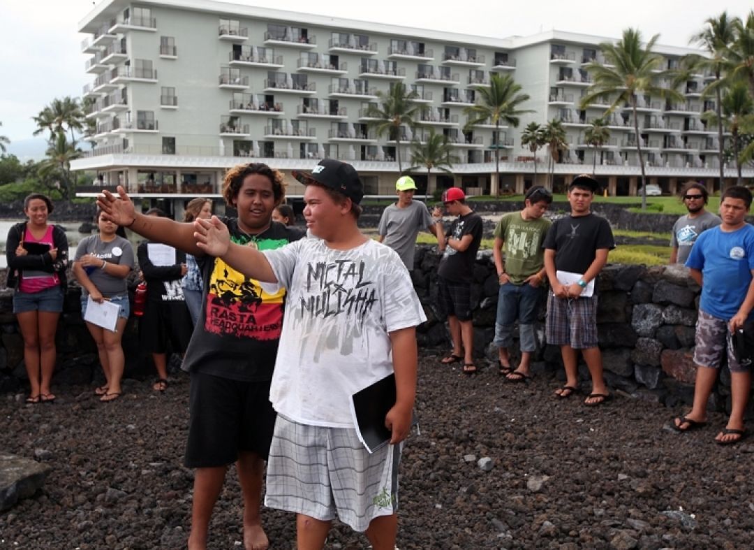 Kamehameha's cultural education complex, Kahalu‘u Ma Kai, will be built on the former Keauhou Beach Resort site. It will offer a wealth of learning experiences deeply rooted in the Hawaiian culture and will compliment existing KS educational programs offered in the region. Above, students from KS’ Kūlia I Ka Pono Kona program demonstrate the horizontal measurements using Hapaiali‘i Heiau.