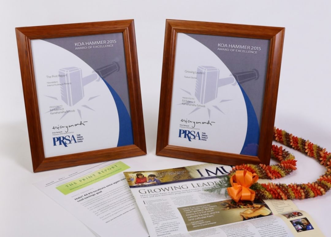 Kalama earned Koa Hammer awards of excellence for his editing of “The Print Report” in the Internal Newsletters category and a second award in the Feature Writing category for his “Growing Leaders” story which appeared in the Winter 2014 issue of I Mua magazine.