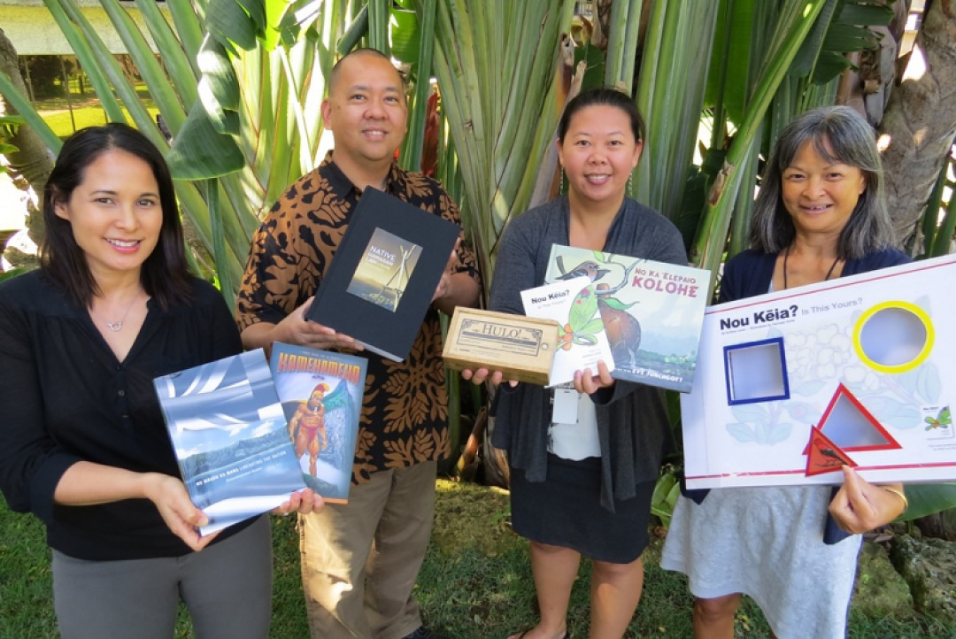 Kamehameha Publishing staffers Jocelyn Calma, Kanaiʻa Nakamura, Lan Tu and Davi Kunishige showcase some of the books and games developed by the KS Division. Visit their booth at this weekend’s festival for keiki games, prizes and 20 percent off Hawaiian titles.