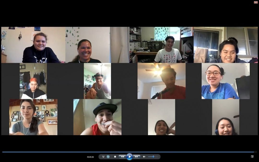Kamehameha Scholars East Hawai‘i Counselor Jessica Waiau (in the second square at the top) has gathered her Scholars’ haumāna virtually via videoconferencing since COVID-19 impacts have closed schools and thrust students into distance learning. Scholars say the sessions have helped them to cope with the trauma and realities of the pandemic.