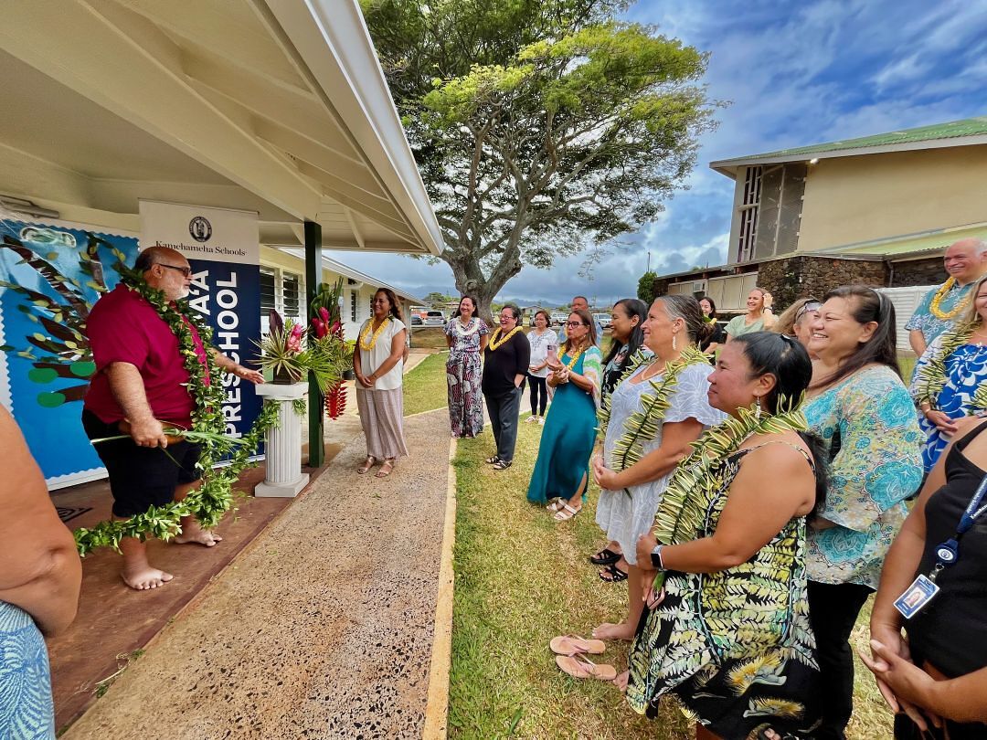 About 30 KS staff and community partners gathered for the blessing of Kamehameha Schools newest preschool in Kapaʻa, Kauaʻi, on July 26, 2024.