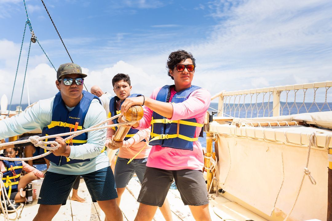 This huakaʻi was much more than a sailing demonstration, it was a convergence and sharing of knowledge and experiences as haumāna from several other summer classes also entered the bay aboard another vessel.