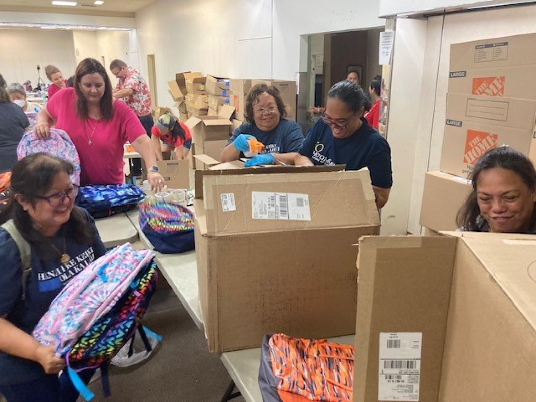 Kamehameha Schools purchased the school supplies and secured a donation of 3,000 backpacks from Lands’ End. Then in September, dozens of volunteers — which included HSTA teachers, retirees and staff as well as Kamehameha Schools employees — gathered at Windward Mall on ʻĀina Pauahi in Heʻeia, Oʻahu to fill the backpacks with supplies, pack them into boxes, and load them onto a shipping container provided by Matson.