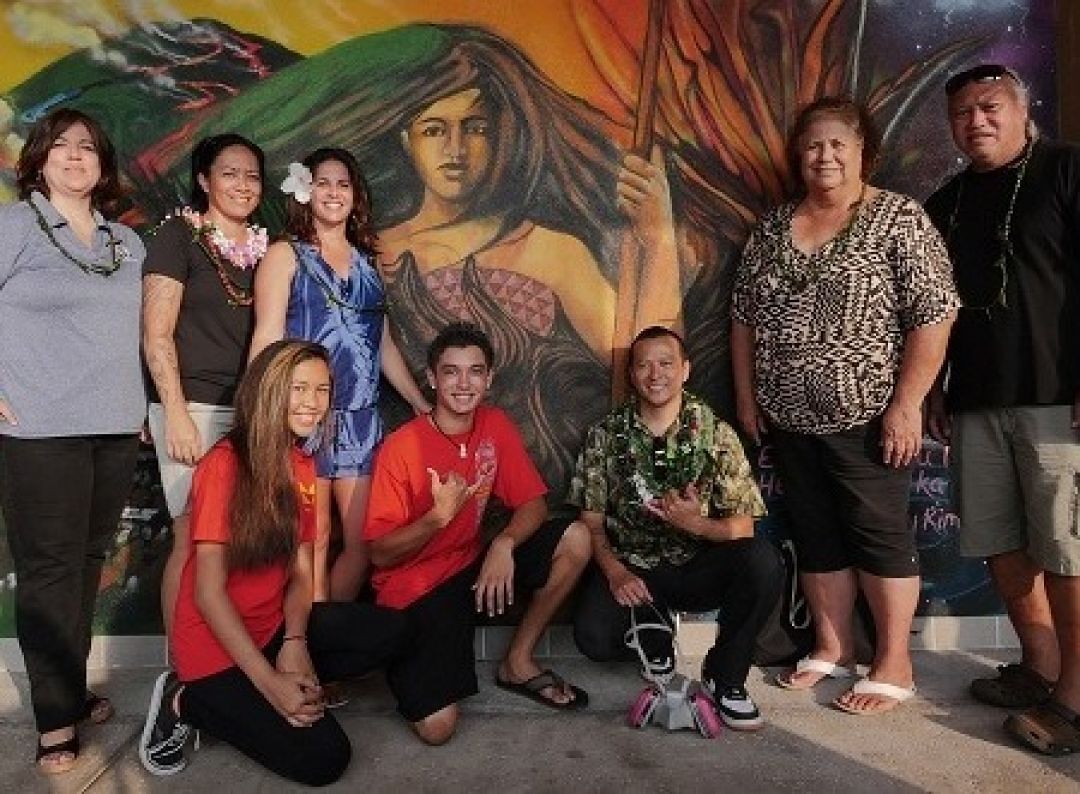 Mele Murals Creative Director Estria Miyashiro (kneeling, right) and students Kayla Cagampang and Kawika Lawrence showcase a mural depicting the battle of Kuamo‘o. Standing are: KS West HI Support Services Manager Deeann Haberly, Mele Murals Project Coordinator Mahea Akau, KS Curriculum and Assessment Coordinator Kanakolu Noa, cultural advisor Kalani Hamm and KS Cultural Resource Specialist Mahealani Pai.