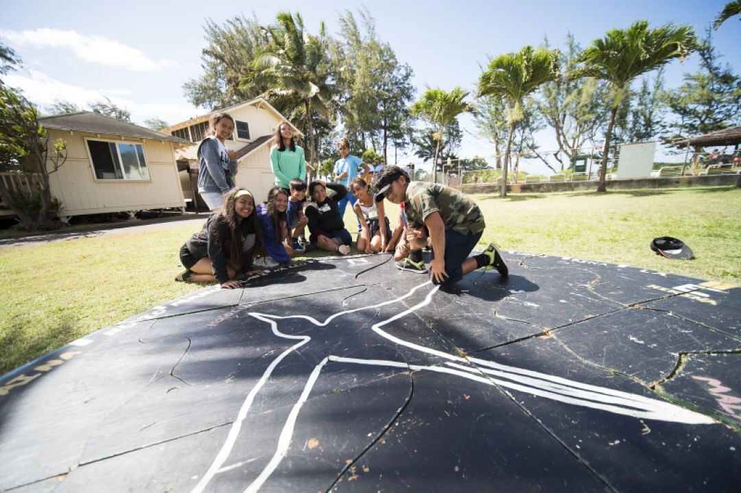 KS’ new five-week summer program for Waialua region haumāna gave them the chance to learn from cultural practitioners, scientists, and ʻāina stewards ways to approach ecological problems. Above, Kilohana Waialua haumāna gather around a huge Hawaiian star compass puzzle after successfully teaming up to piece it together.