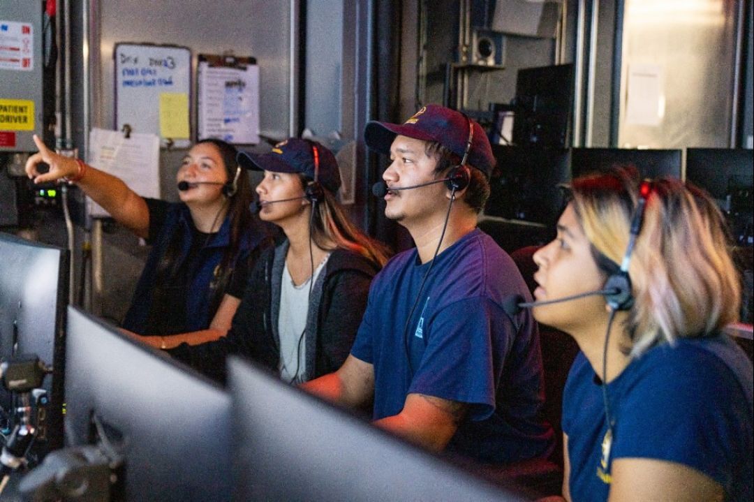 Nai‘a Anderson, Darrian Muraoka KSK’15, Justin Shiffler KSM’18 and Keahe Silva KSK’21 study the results of the multibeam sonar used to map the seafloor in Papahānaumokuākea. Photo courtesy: Ocean Exploration Trust, Nautilus Live, Nova West