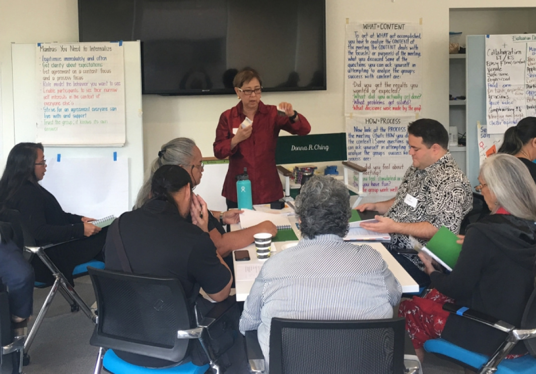 Dr. Donna Ching, founder of the Pacific Center for Collaboration helped bring facilitative skills training to a diverse group of leaders who serve the Native Hawaiian community. The two-day session was sponsored by Lili‘uokalani Trust and Kamehameha Schools.