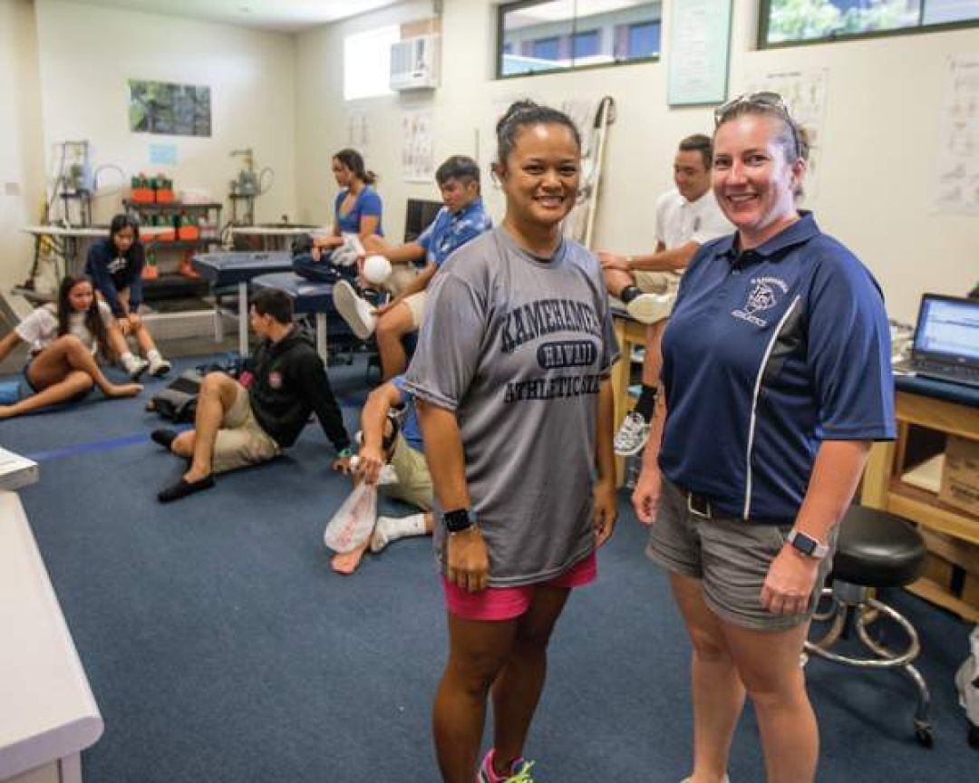 KS Hawaiʻi athletic training staff Zeny Eakins, left, and Amy Shirk work with student athletes. Photo: Hollyn Johnson, Hawaiʻi Tribune-Herald.