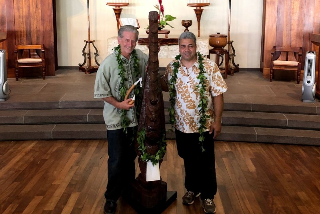 Carving a partnership: Hoʻokahua Cultural Specialist and Kaʻiwakīloumoku carver Kumulaʻau Sing KSK’89 collaborated with Maōri master carver Jared Pere of the Polynesian Cultural Center (left) to create a poupou – or ancestral post – as a tribute to esteemed Māori elder Sir Hector Busby.