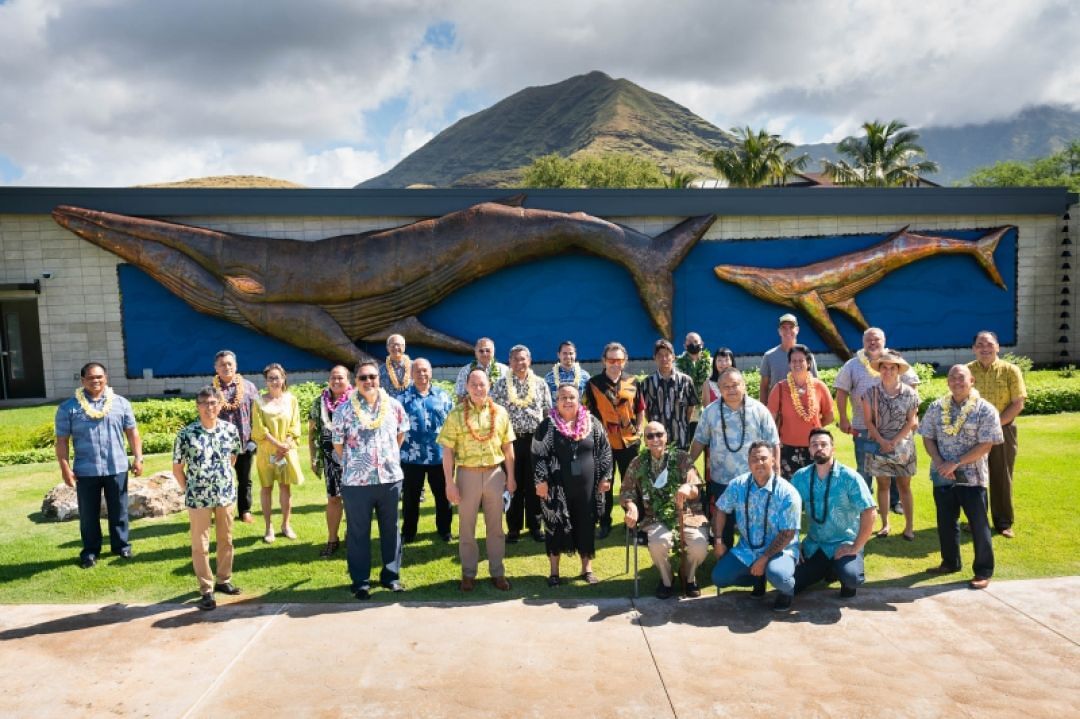KS leaders, project partners and Waiʻanae Coast community members gather at the front of the newly blessed Kalanihookaha Community Learning Center. The life-sized humpback whale sculpture – Koholā Ola, was brought to life by the many hands of Waiʻanae Moku keiki and community members under the guidance of artist and area resident Sooriya Kumar.