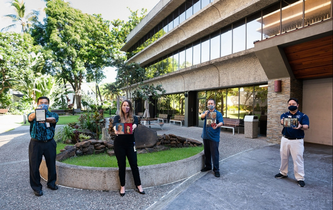 Since early March, 40 KS staffers stepped up to the challenge and assumed additional duties to help safeguard the health and well-being of our haumāna and staff as part of our COVID-19 Response Team (CRT). Here, team members Neil Yamamoto, Crystal Busey, Jason Choy and Reid Takano showcase the daily employee wellness check-in app and fellow CRT members across the pae ‘āina.