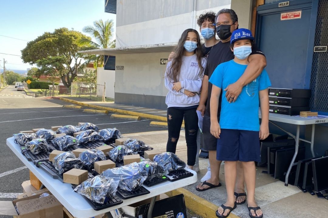 Members of the Kelley family — Sanoe, Mataio, Joel, and rising fifth grader Timoteo — helped pass out computers during the distribution at Ke Kula Kaiapuni ʻo Ānuenue Hawaiian language immersion school.
