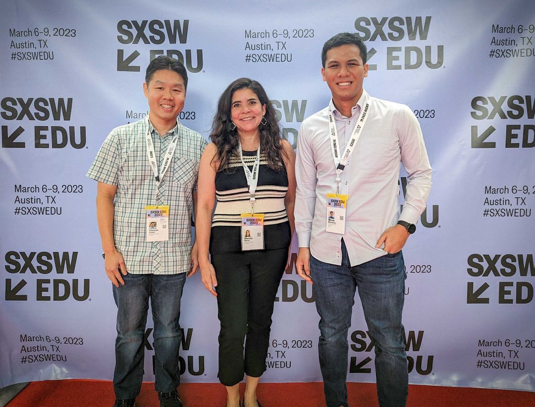 Kamehameha Schools ET Education Technology Services team members Clinton Iwami, Wendy Oliver, and Micah Mizumoto KSK’10 pose for a photo at the 2023 SXSW EDU Conference.