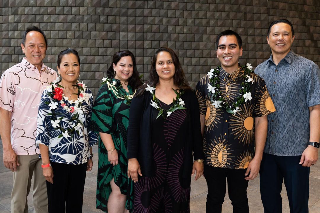 Certified kumu from across O‘ahu were honored at a National Board for Professional Teaching Standards ceremony at the Hawai‘i State Capitol. Above are Kamehameha Schools CEO Jack Wong; certified KS Kapālama teachers Ruby Redona, Daina Enabe, Dana Kaeo, and Kalā Aukai KSK'12; and KS Kapālama Head of School Dr. Taran Chun KSK'95.