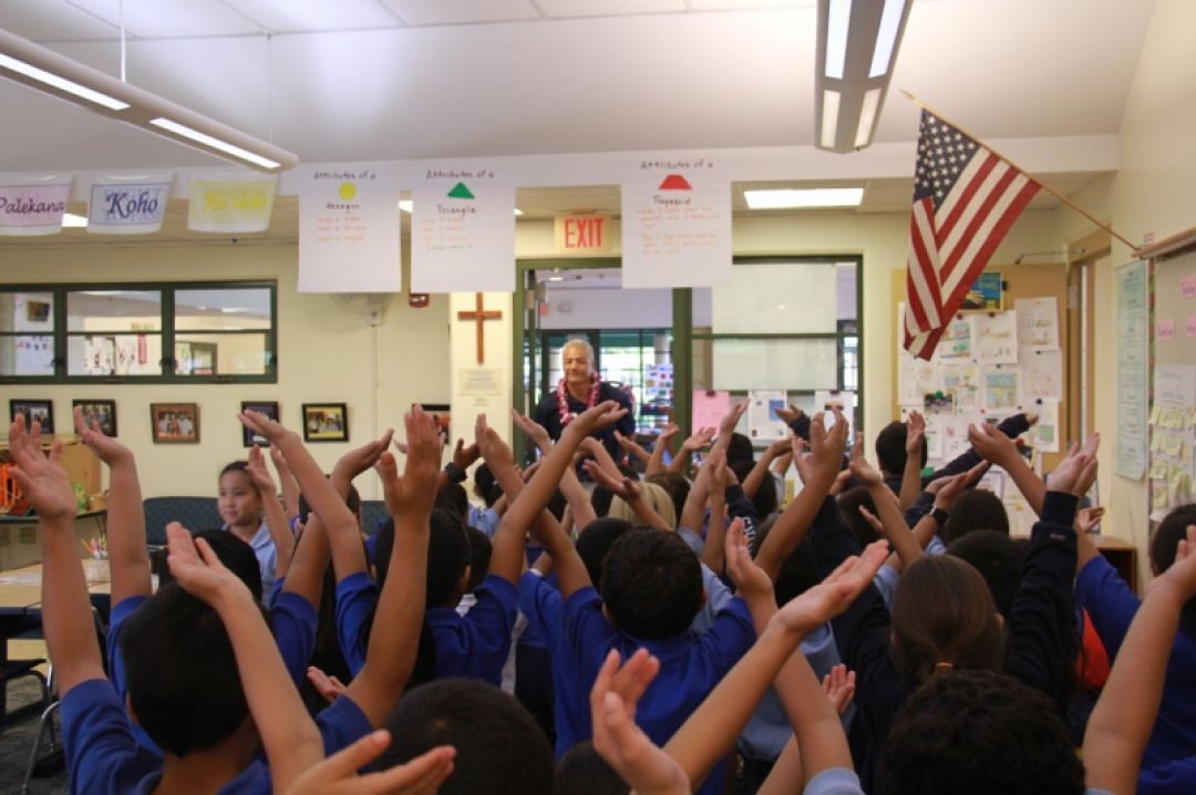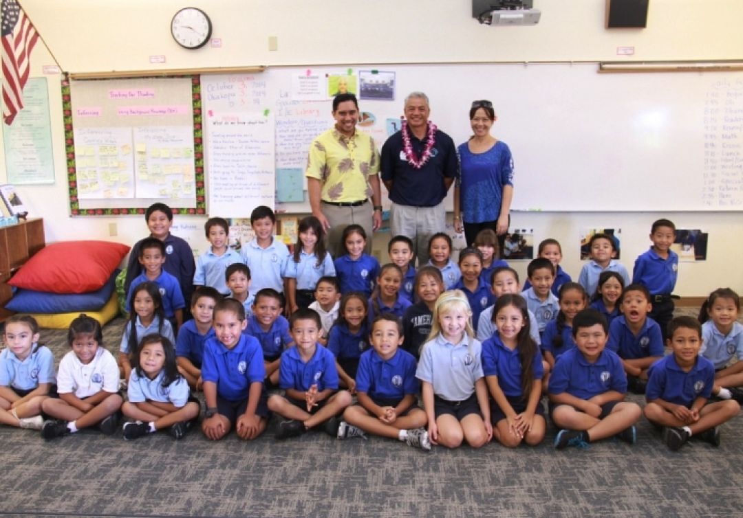 Kamehameha Schools Hawaiʻi first graders recently heard a firsthand account of what it’s like to be a crew member on the Mālama Honua Worldwide Voyage.
