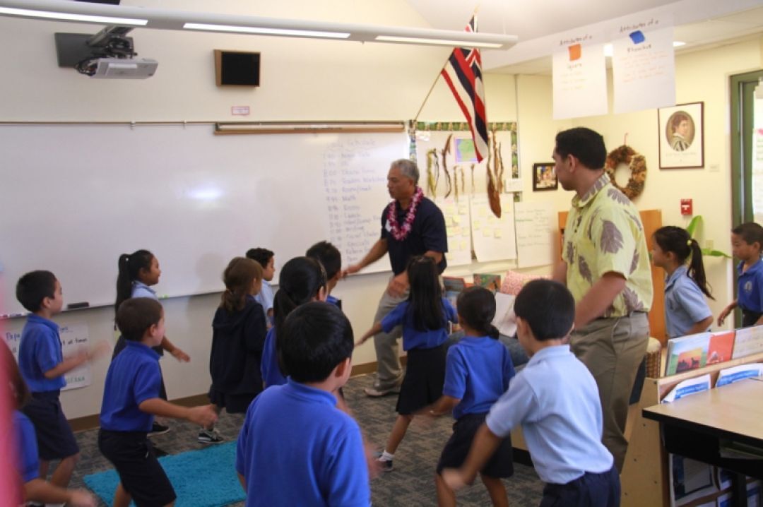 Before sharing his stories, Wong performed an oli kāhea (a chant requesting entry) and first grade students and their kumu Kaleo Kaleohano and Waianuhea Paleka replied with the school’s oli komo (a chant granting entry).