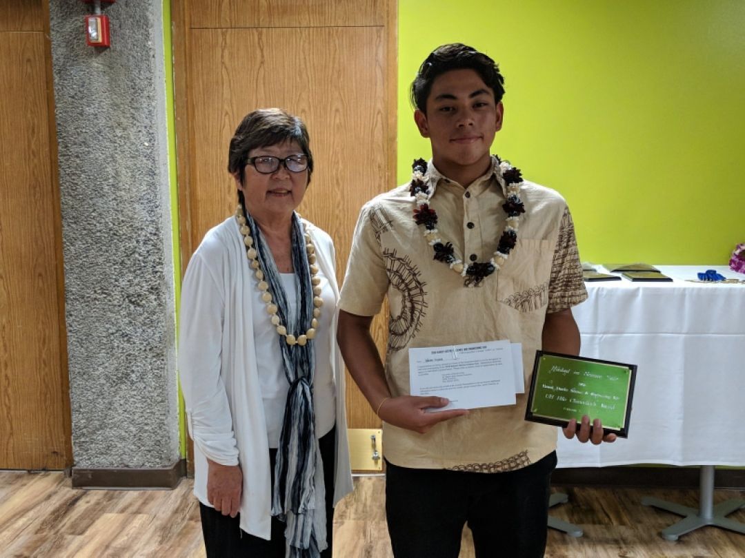 Senior Kahiau Kiyuna receives the award from UH Hilo Interim Chancellor Marcia Sakai