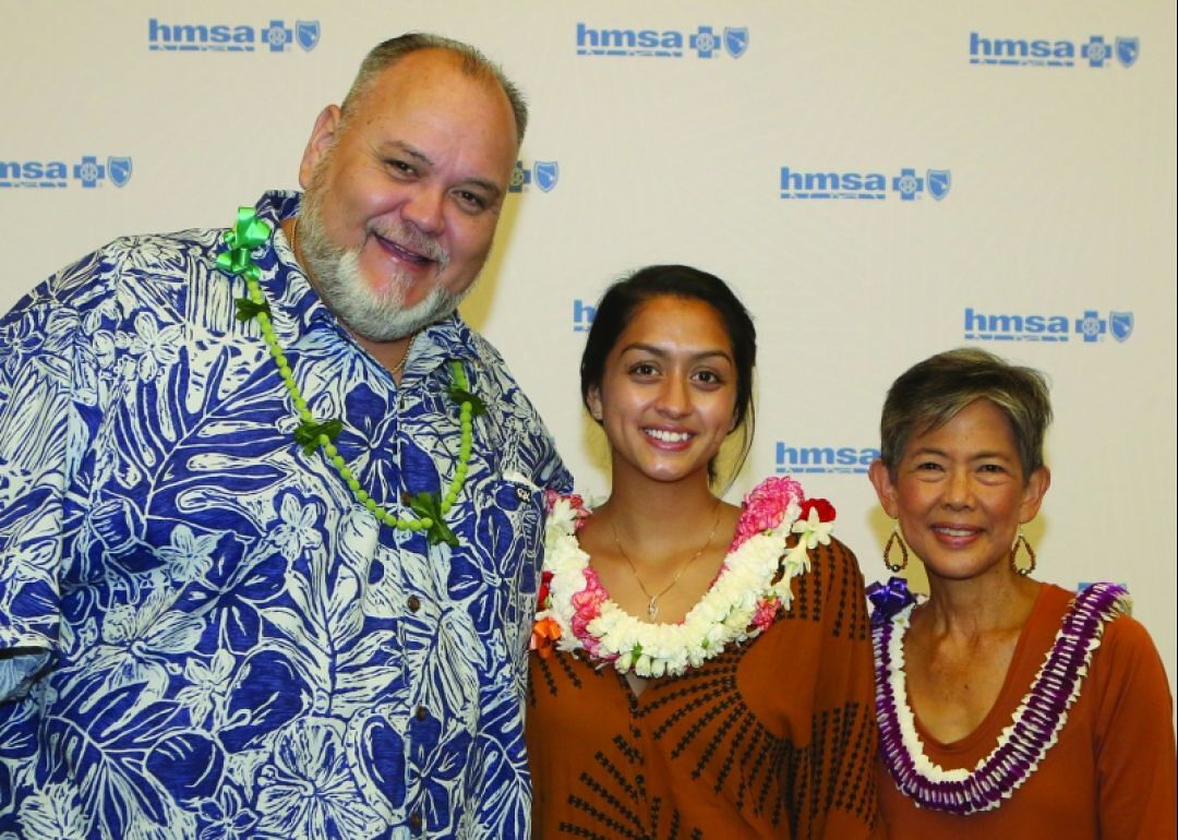 Pōmaikaʻi Evans-Bautista, a 2019 graduate of Kamehameha Schools Hawai‘i, was presented with a $5,000 scholarship as part of the Kaimana Awards & Scholarship Program at the Hawaiʻi Convention Center on June 8. The student-athlete was presented with the award by Robert Kekaula, KITV news anchor and KS Kapālama alumnus, and Elisa Yadao, HMSAʻs senior vice president and community engagement officer.