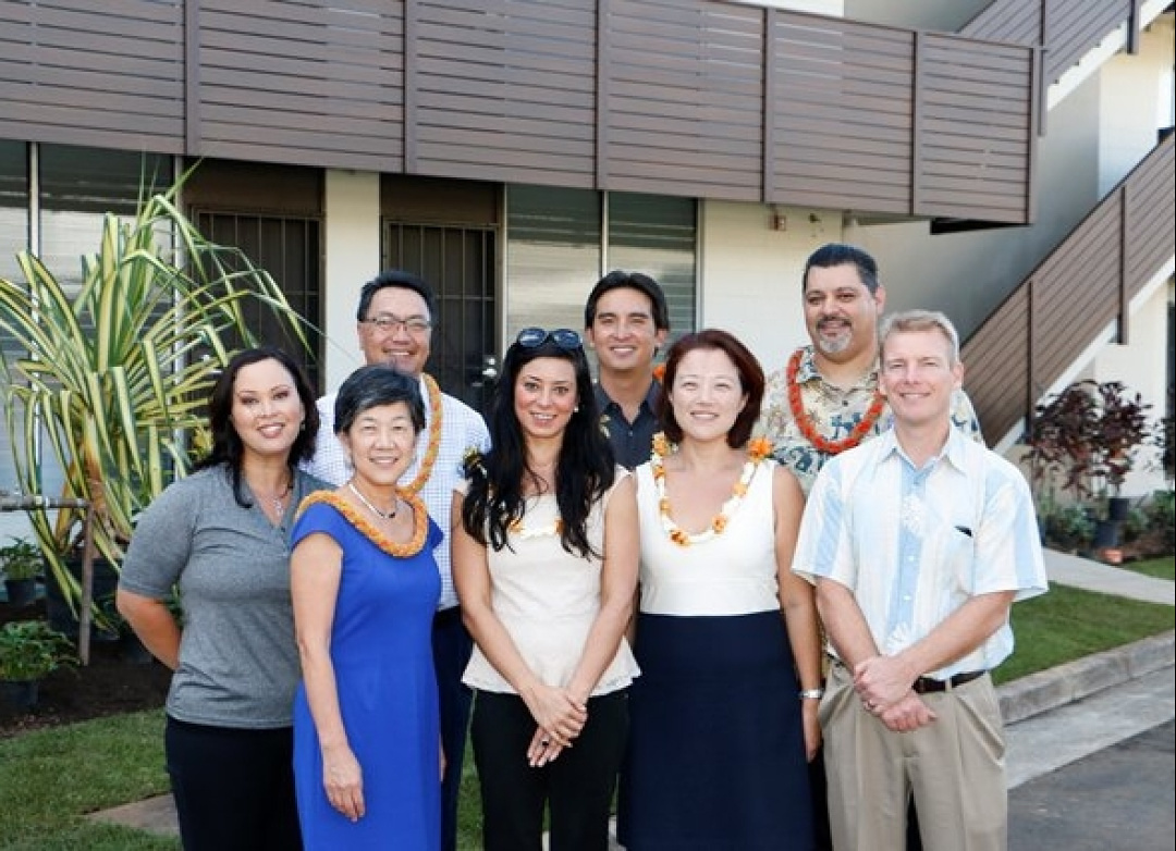 The KS team celebrates the completion of the Kolo Village renovation. From left: Communications Specialist Mae Russell, Endowment VP Elizabeth Hokada, Trustee Chairman Lance Wilhelm, Senior Real Estate Analyst Constanza Asfura-Heim, Senior Asset Manager Casey Ching, Development Manager Sharon Gi, Chief of Staff Walter Thoemmes and Asset Management Director Kit Millan.