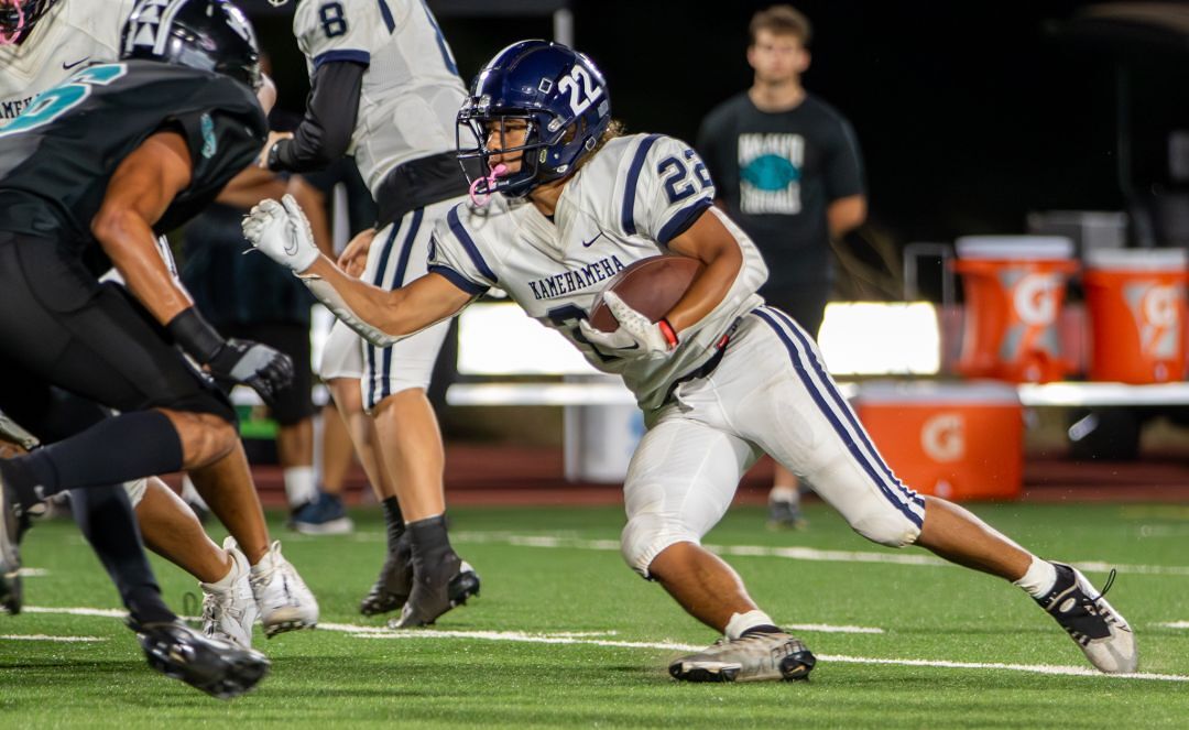 KS Maui sophomore Zede Campbell runs the ball during the Warriors’ victory over Nā Ali‘i on Friday (Sept. 15) at King Kekaulike. Campbell is one of four players from West Maui on the varsity football team.