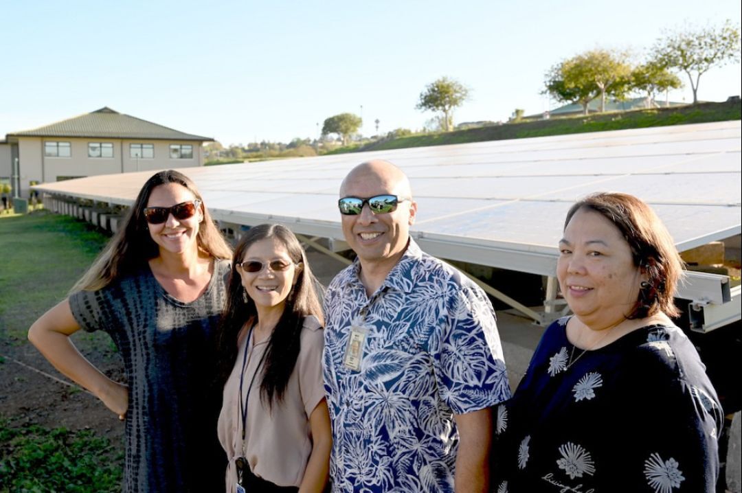 Hawaiian Electric Co. Commercial Account Manager Michaellyn Burke, KS Executive Strategist Dora Nakafuji (S&T), KS Maui Director of Campus Operations Danny Mynar and local Apparent, Inc. representative Iris Peelua and others were on hand to celebrate the blessing of the renewable energy microgrids.