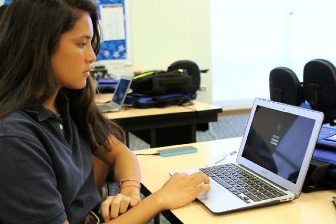 Senior Brandy Takiguchi waits patiently as she creates her Apple ID for her new Mac laptop. All students received brand new devices through the schoolwide PC to Mac switch this year. August 4, 2014, was the first day of school at KS Maui for the 2014-15 school year.