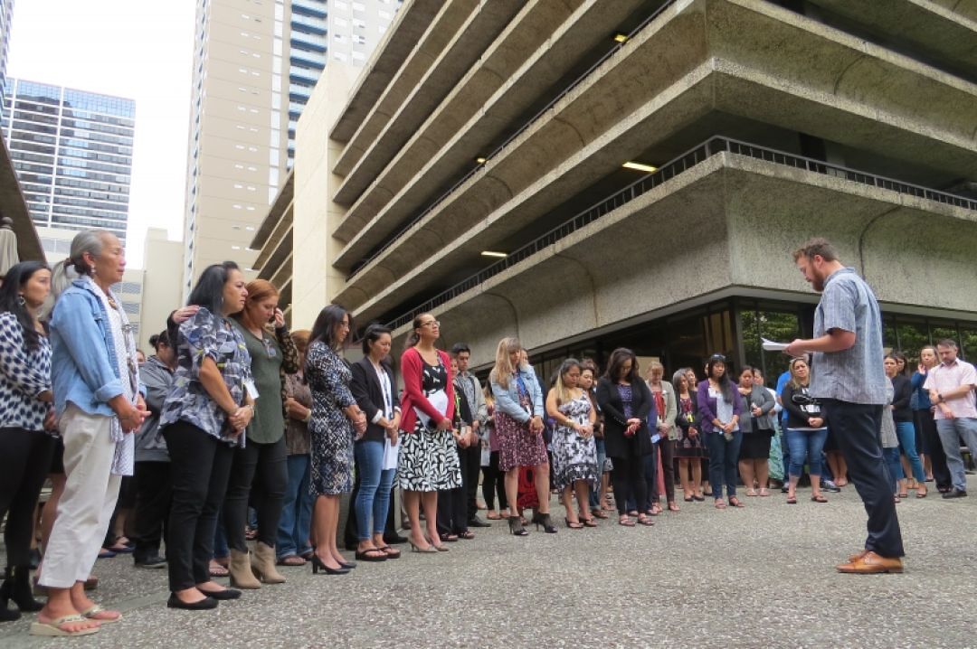 Staff members at KS’ Kawaiaha‘o Plaza headquarters in Kaka‘ako at also gathered in remembrance of the victims. Kamehameha staff members across the state were encouraged to take a moment of silence at 10 a.m. wherever they were.