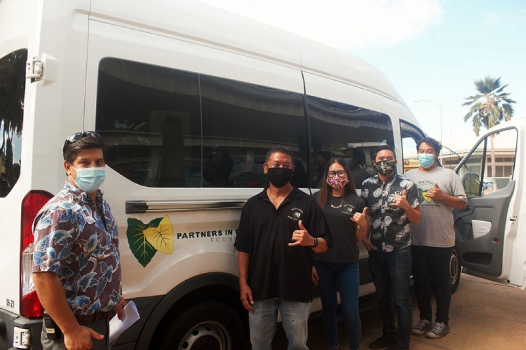 WiFi on Wheels partners recently gathered for a vehicle demonstration which included Kamaile Academy Principal Paul Kepka, Partners in Development Foundation Program Manager Terry Nakamura, PIDF Teaching Assistant Napualani Kealoha, HawaiiKidsCAN Executive Director David Miyashiro, and PIDF Teaching Assistant John Nihipali.