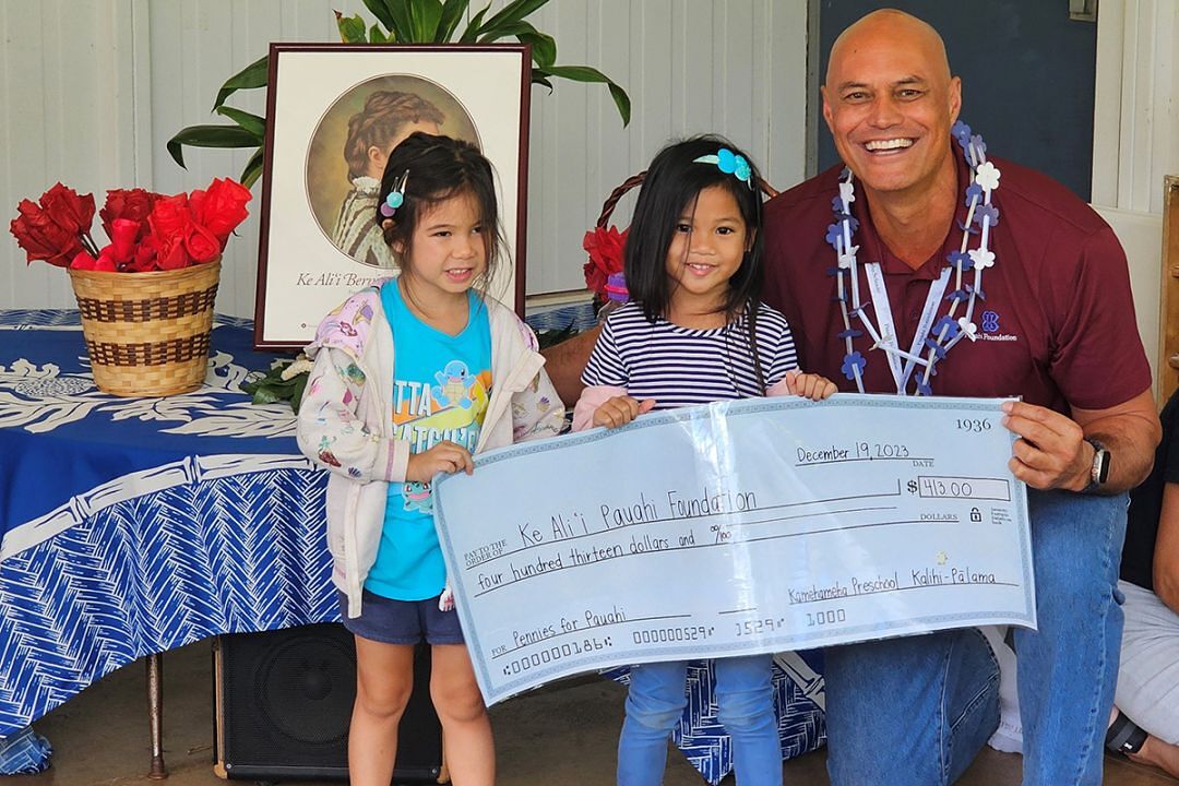 More than 120 haumāna, kumu and staff at KS Kalihi-Pālama Preschool welcomed the Alumni Relations team this morning to present the Pauahi Foundation with a check for $413 raised by collecting “Pennies for Pauahi!”