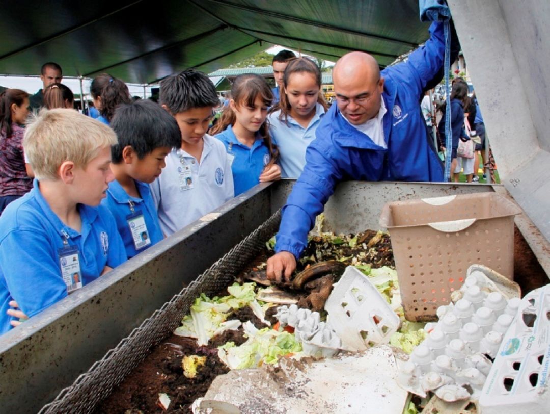 The newly launched Sustainability Awards program will recognize employees who have implemented eco-conscious practices and programs. Above, middle school P.E. kumu Koy Omo shows students how the campus uses worms to break down Kalama Dining Hall food waste into an organic fertilizer called vermicast, at a campus sustainability fair.