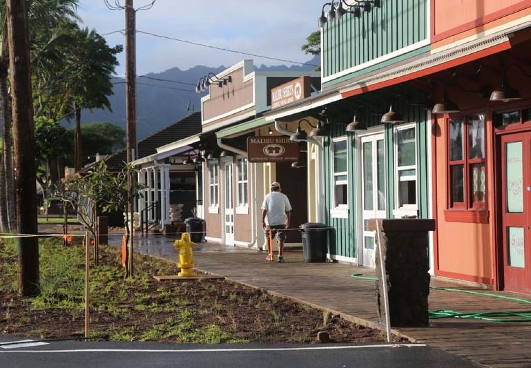 The new Hale‘iwa Store Lots walkway begins on the Mokulēʻia side of the project in front of Uncle Bo's restaurant and passes Clark Little Galleries, Greenroom, and Malibu Shirts.