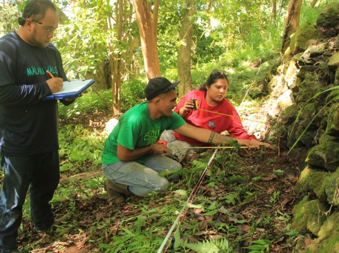 Wahi Kūpuna Internship Program participants profile map a historical trail wall in Koholālele, Hāmākua, Hawaiʻi. They are: (l-r): Kalamaʻehu Takahashi, Lyle Auld, and Kaile Luga. Student interns earn three college credits in Hawaiian studies or anthropology and hands-on experience in cultural resource management.
