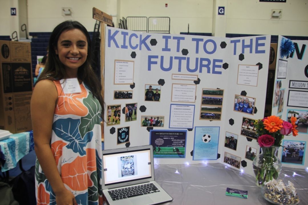 Senior Kaila Ambrosio presents her Kick It to the Future event for a panel of community judges, parents and fellow students at the Senior Expo for the Class of 2019, Kamakaokaniuhi.