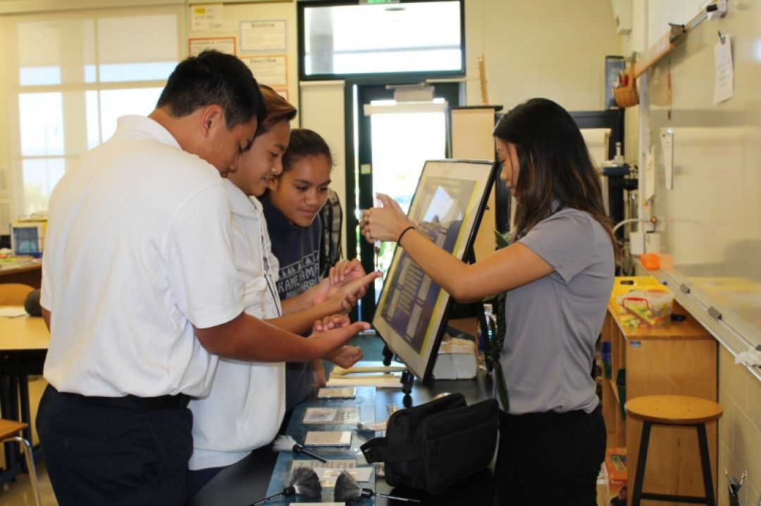 Students were very interested in the tools used by Amber Corpuz (KSM ʻ07) in her career as a Police Evidence Specialist.
