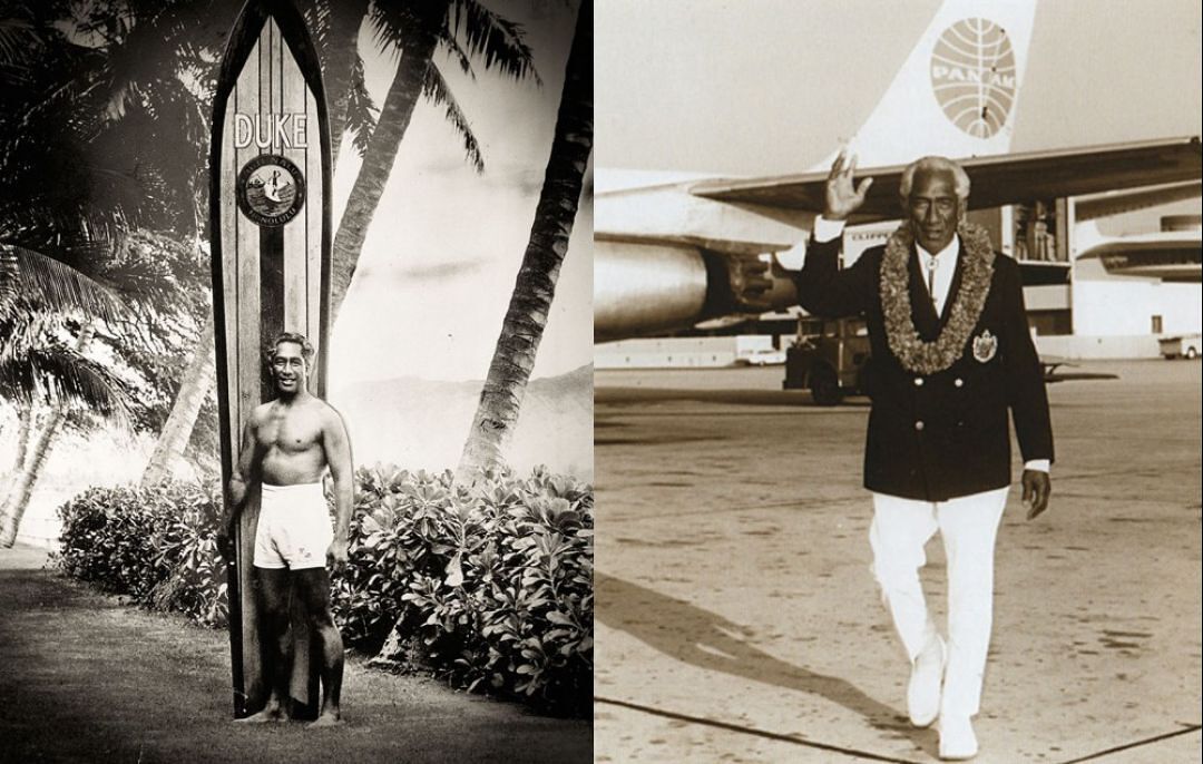 Left: Duke Kahanamoku in the 1930s at Waikīkī Beach. The emblem under DUKE on the board is that of Hui Nalu, the very first surf club to exist in Hawaiʻi. This surfboard is now in the collections at the Bernice Pauahi Bishop Museum. Right: Duke Kahanamoku, Hawai‘i’s “Ambassador of Aloha.”