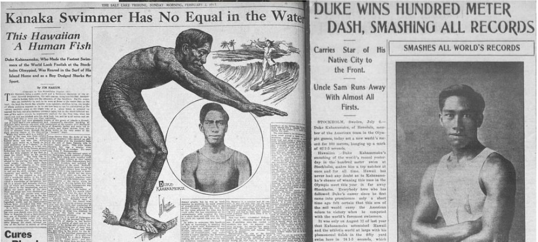 Newspaper clippings featuring Duke Kahanamoku (Left, Salt Lake Tribune, Feb. 2, 1913; right, reprinted from original in Honolulu Advertiser, Dec. 31, 1999)