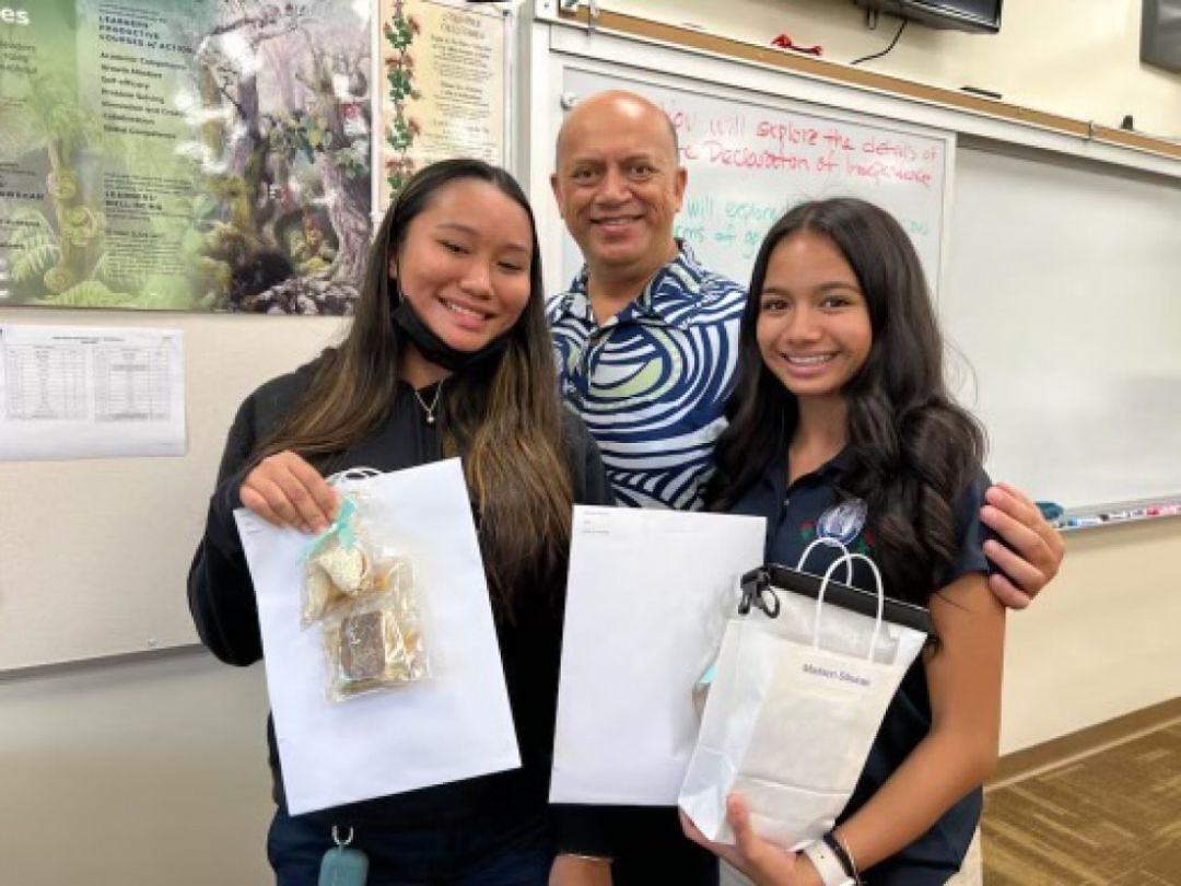 Kula Kiʻekiʻe Poʻokumu Dr. Lehua Veincent presents makana to sophomores Kawaikapualani Correa and Madison Sibucao.