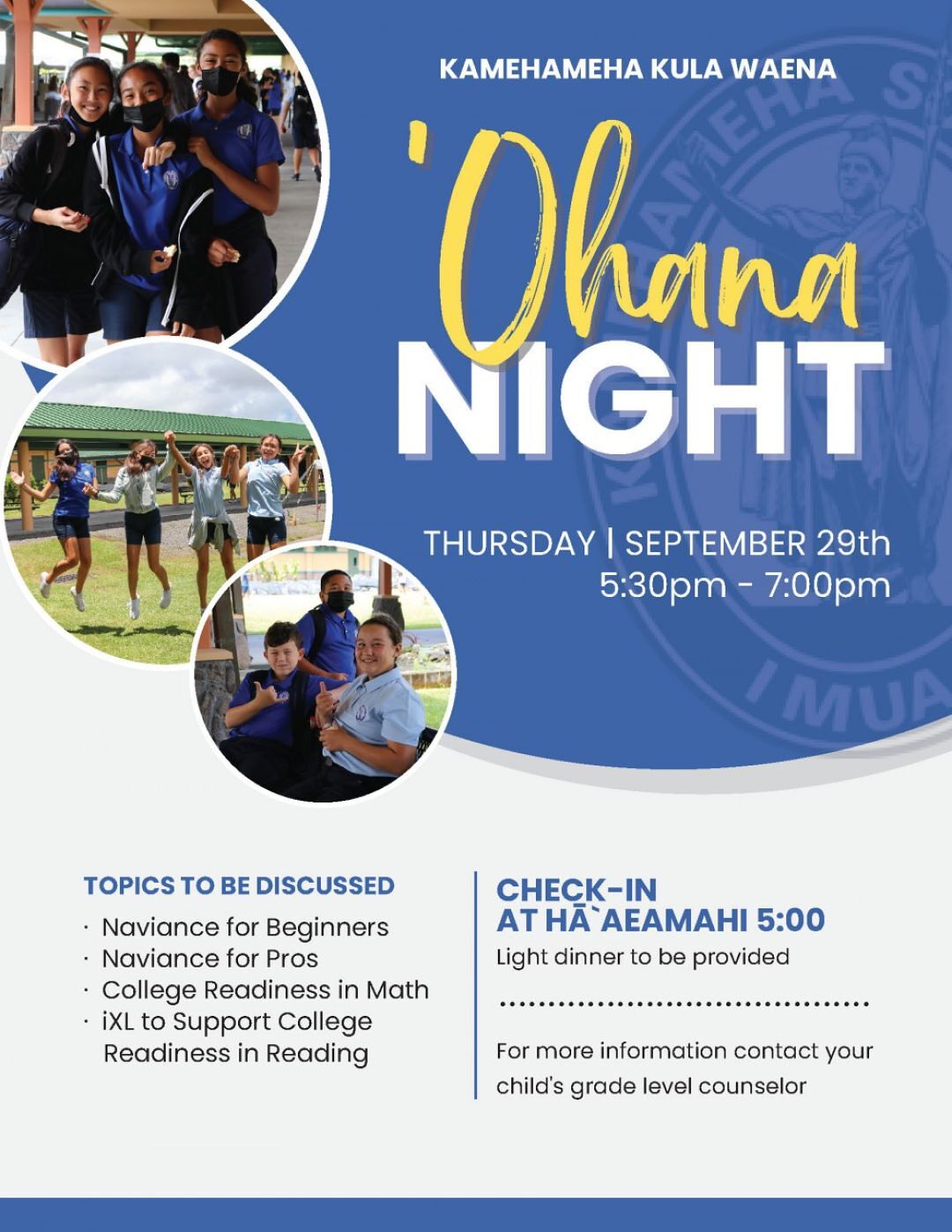 This Thursday, September 29, Kamehameha Schools Hawaiʻi Kula Waena ʻohana are invited to join us for an ʻohana night from 5:30 to 7 p.m. (with a light dinner served at 5 p.m.) to learn more about college readiness resources and support KS Hawaiʻi provides to haumāna and ʻohana so you can be well prepared for the process!
