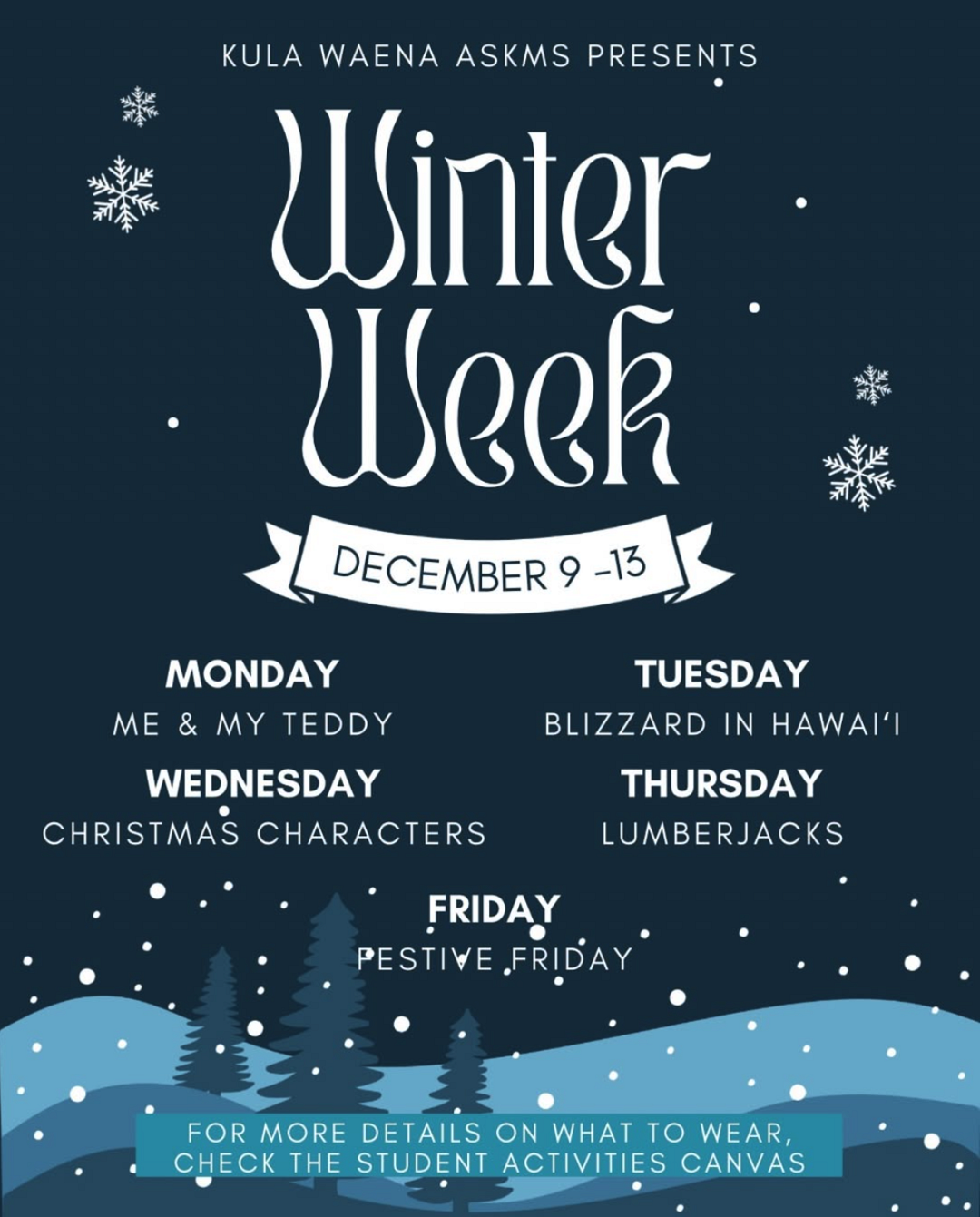Kula Waena ASKMS is excited to present Winter Week 2024! Starting Monday, December 9, there will be daily dress-up themes to celebrate the holiday season.