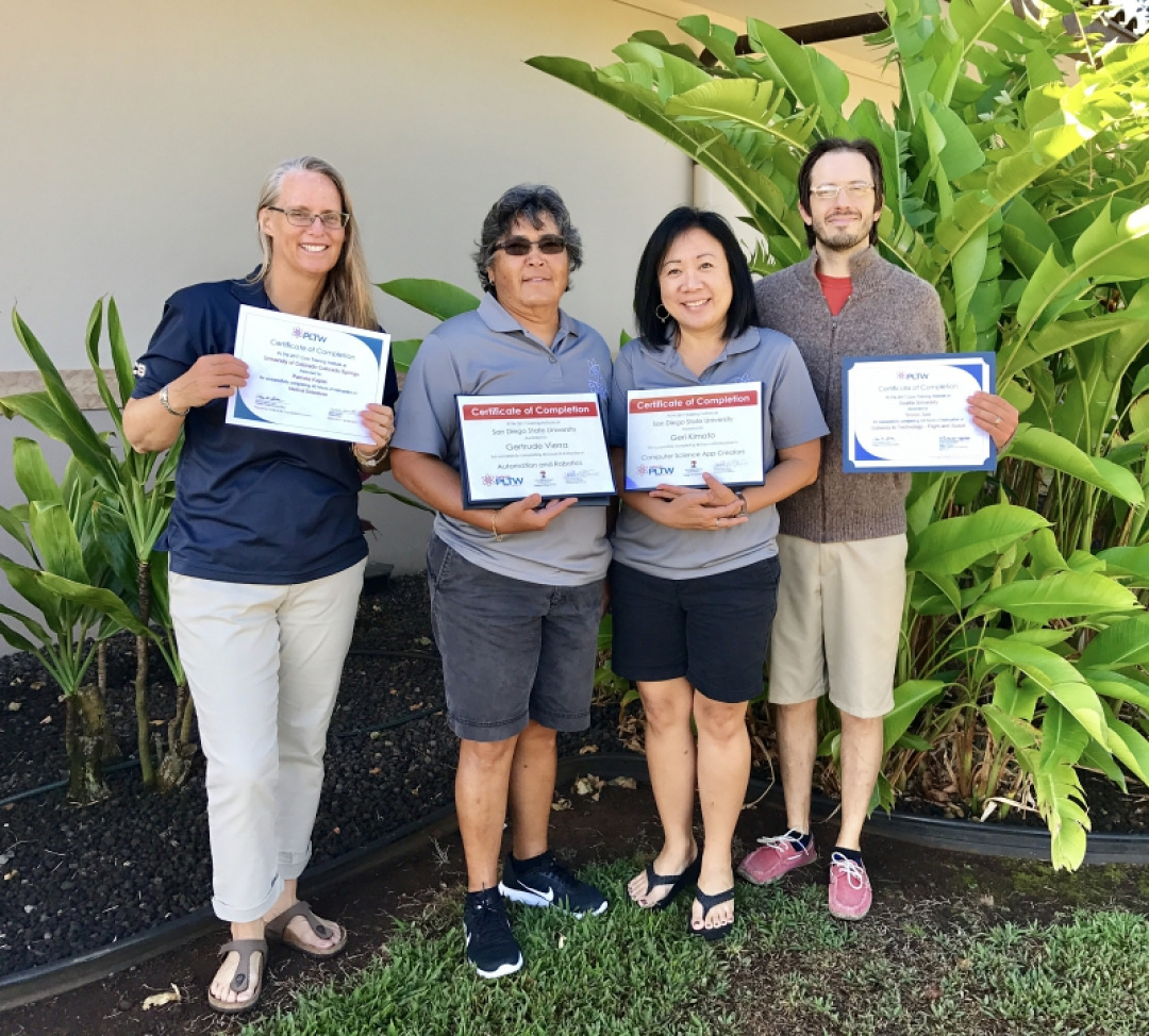 During the summer break four KS kumu attended an intense week of a professional development program called Project Lead the Way (PLTW) in San Diego, Seattle, and Colorado. Attendees were (from left to right in photo) Kumu Kapisi, Kumu Vierra, Kumu Kimoto, and Kumu See.