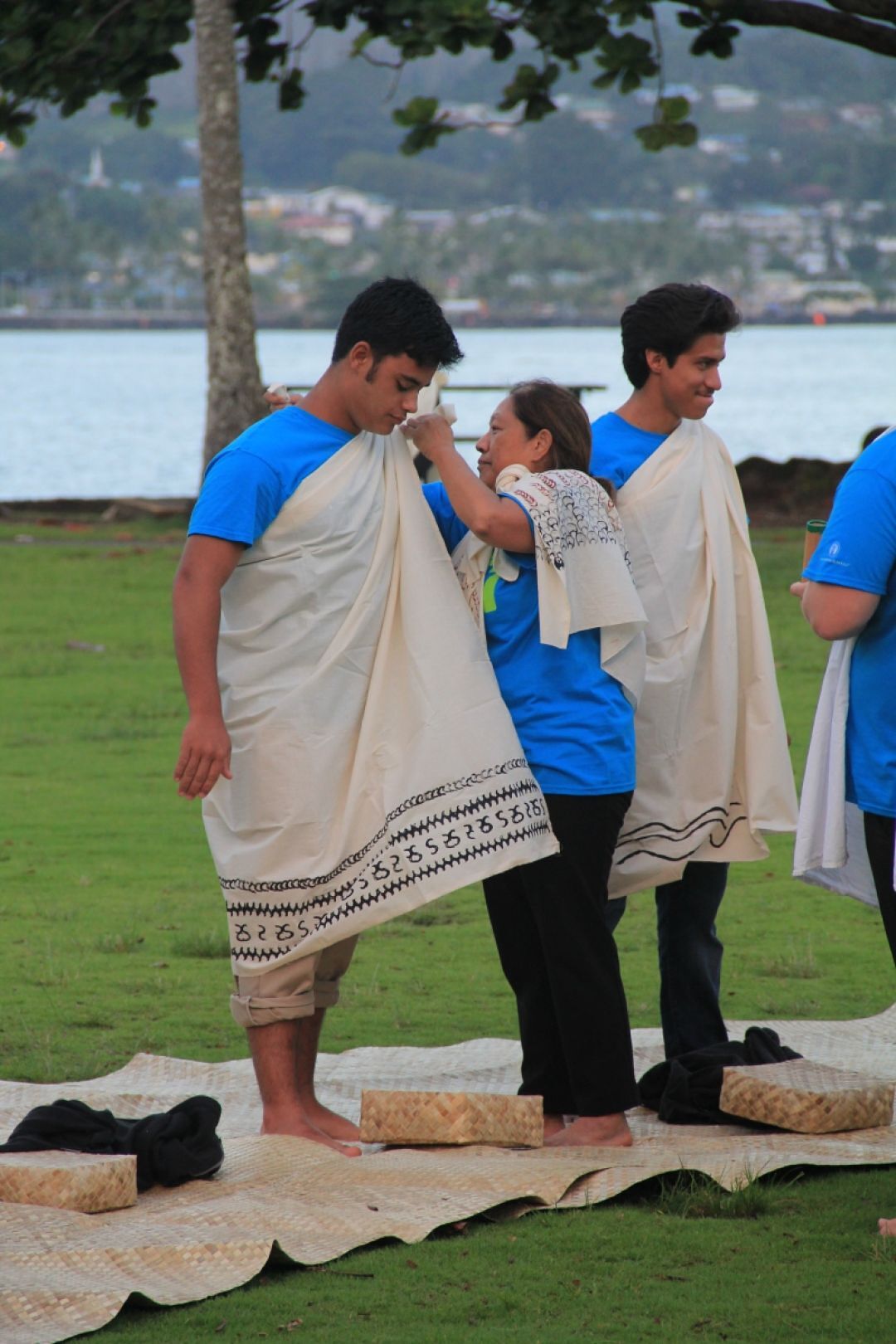 A final ceremony was held the following morning at Mokuola (Coconut Island). Students, families and staff assembled at 5:30 a.m. under the light of the full moon. The students’ kīhei were tied and stamped to symbolize their new status as college students.