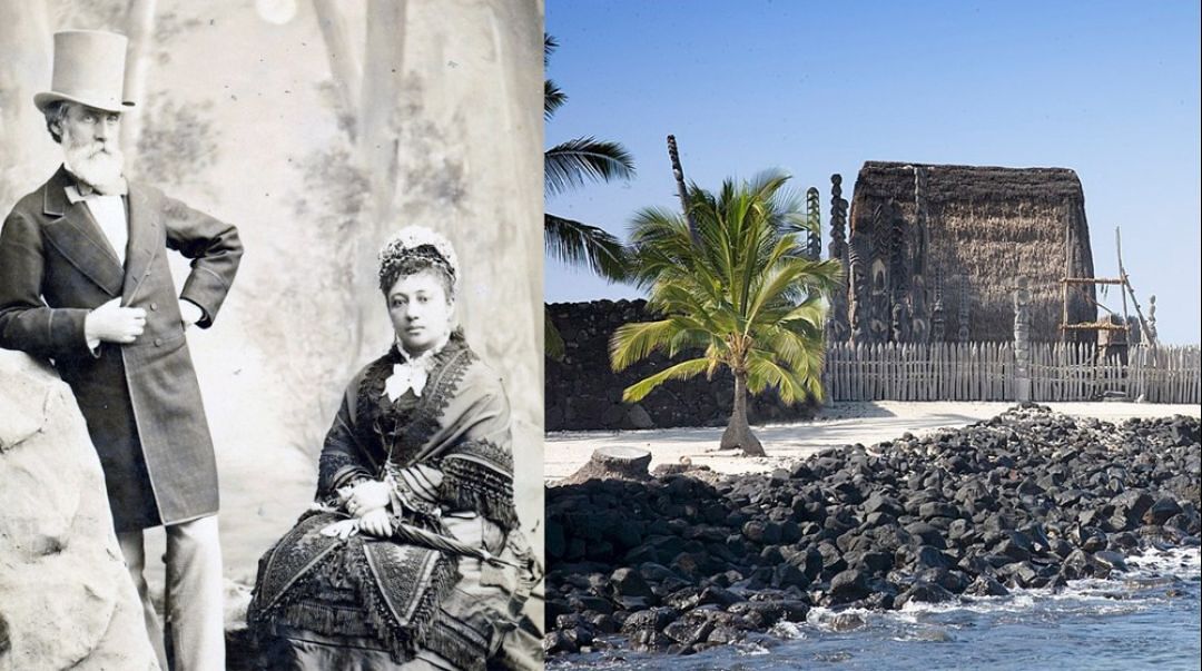 Born on January 25, 1822, Charles Reed Bishop was married to Ke Ali‘i Bernice Pauahi Paki Bishop until her passing in 1884. In this Kūkahekahe, we share one of the ways he sought to strengthen Pauahi’s legacy by protecting wahi pana – legendary places – important to Pauahi and her people. Above, Charles Reed Bishop and Ke Ali‘i Pauahi in San Francisco, 1875. Courtesy of the Kamehameha Schools Archives. Right: Hale Keawe, Puʻuhonua o Hōnaunau in 2009. Carol Highsmith, Courtesy of the Library of Congress.