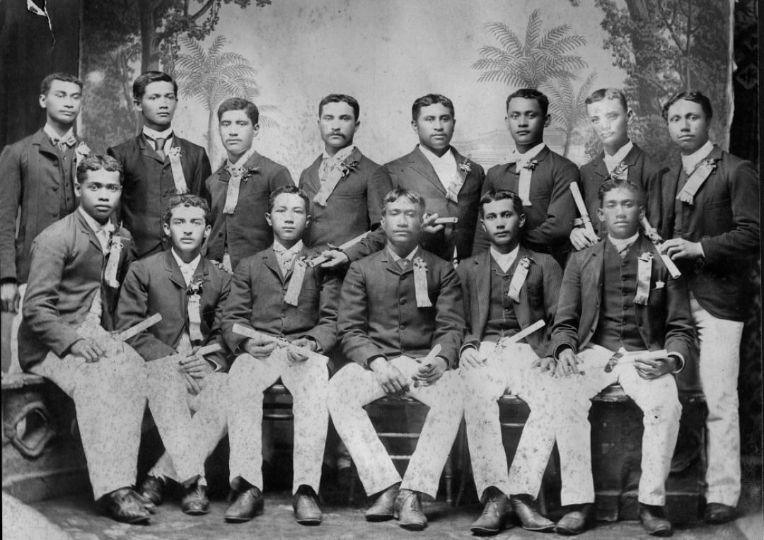 The first graduating class of The Kamehameha School for Boys in 1891. Seated from left to right: John Waiamau, Sam Keliinoi, William Olin Crowell, Robert Pahau, Charles Blake, Thomas N. Haae. Standing: William Manaole Keolanui, Fred Beckley, Soloman Hanohano, William Rathburn, Sam Kauhane, Moses Kauwe, Charles E. King, and W. E. Brown.