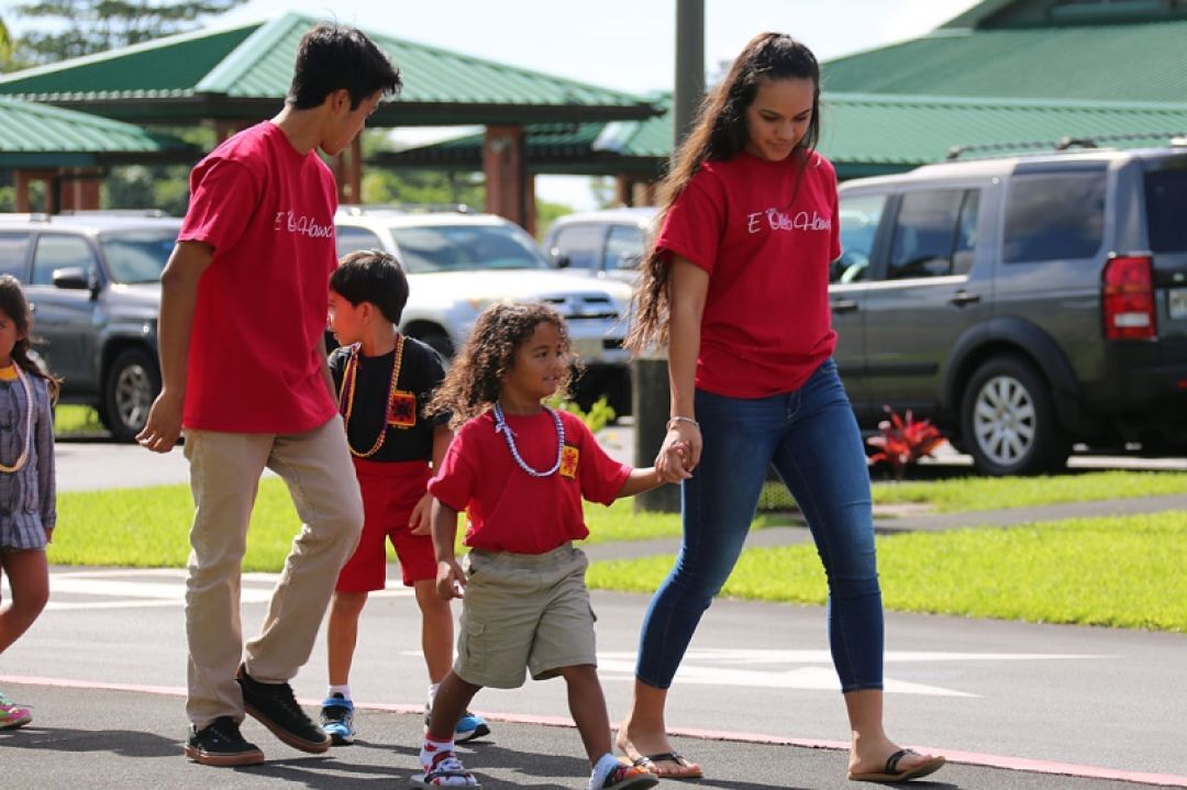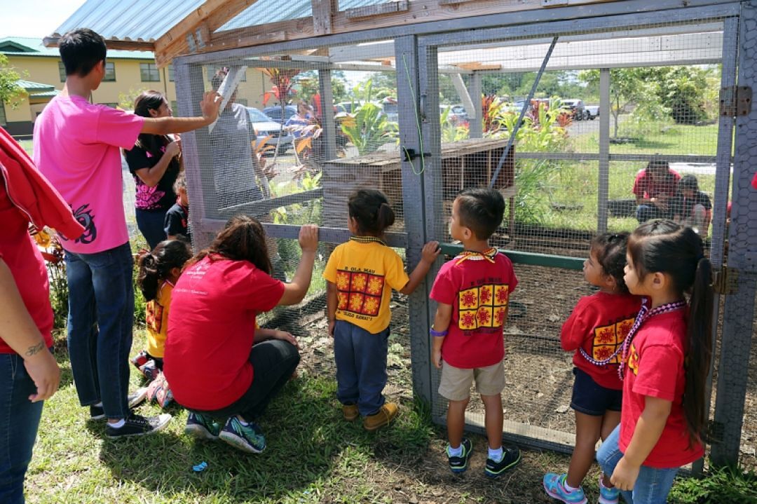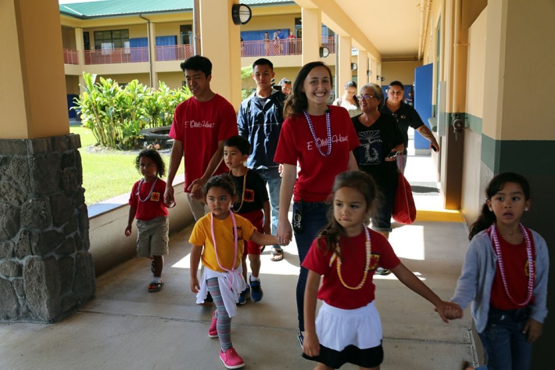 KSH students lead Pūnana Leo o Hilo preschoolers on a tour of the Keaʻau campus.