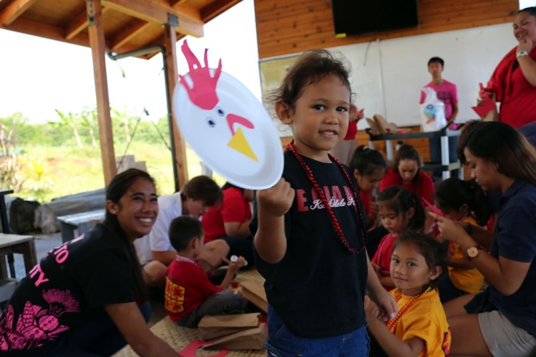 After being welcomed to campus, KS students led the preschoolers on a campus tour, followed by breaking up into four activity groups. One group would learn hula and have a chance to dance. Another taught about animals with a reading activity followed by an exploration of the on-campus mala (garden) to see the animals there and create a hana noʻeau (craft) chicken mask. Another group hosted a coloring activity to teach a lesson about colors. Finally, students in the last group could learn how to kuʻi kalo (pound taro) to create kuʻi ʻai.